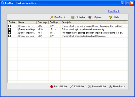 AutoTask helps you to automate all of the repetitive tasks you face each day. It records all operation of mouse and keystrokes and saves them as macros. You can also create macros manually with macro editor. AutoTask can then play back the recorded macros to automate recorded tasks any number of times. It works on any Windows applications. Hundreds of possible hotkeys are available to run macros. And you can play back macros at schedule time AutoTask is very easy to use, it saves time and reduces the number of repetitive tasks in your day. It doesnt require any programming experience. Key features: Record all events of mouse and keystrokes of any Windows applications Create or edit macros with easy-to-use macro editor Repeat playing back macros for any number of times Save time and reduce the number of repetitive tasks in your day Play back macros with hotkeys or at schedule time Easy to use and dont need any programming knowledge.