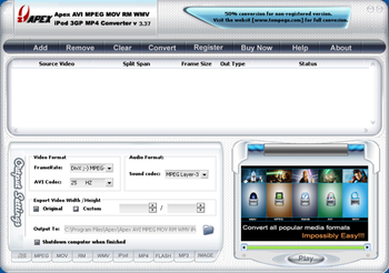 Apex AVI MPEG MOV RM WMV iPod 3GP MP4 Video Converter is the best video converter software to convert all popular video formats to other many other formats. It is designed to meet all your needs of convert file from avi, mpeg, mov, wmv, rm vcd, dvd to avi, mpeg, mov, wmv, rm, rmvb, iPod, Flash swf, Flash flv, Zune, mp4, 3gp, xBox, ppc, mp3. Extremely fast conversion speed and friendly user interface let you convert video files between many formats with ease.