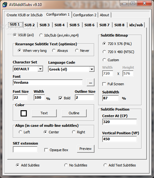 The fact that the software allows you to alter the subtitle timing by adjusting time shift or duration, and that it comes with three separate applications for renaming subtitles, creating SRT files out of IDX / SUB pairs, or adjusting bit-rate, recommends AVIAddXSubs as a reliable and complex subtitle converter.
