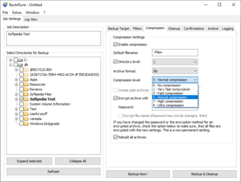Backups may be stored in a compressed format. If you choose to enable compression, you can specify the directory depth from which on all files are packed into a single archive file. This way you can avoid very large archives and improve overall safety of you backup process.