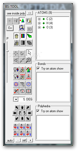 You can make the app show deleted atoms, enable or disable a color or black & white display mode, rotate the structure to different angles, check out the distance between two atoms, zoom in or out of the structure, create a bond between two atoms, as well as generate a polyhedron.