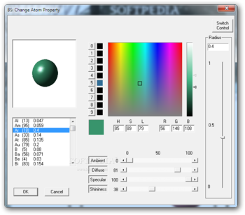Balls & Sticks lets you delete objects, edit bonds, remove a family of bonds, change the radius of an object or atom, modify the color and lighting property of an object, store the current state of the tool into a snapshot list in order to reload info with ease, undo or redo your actions, and make use of hotkeys for faster actions.