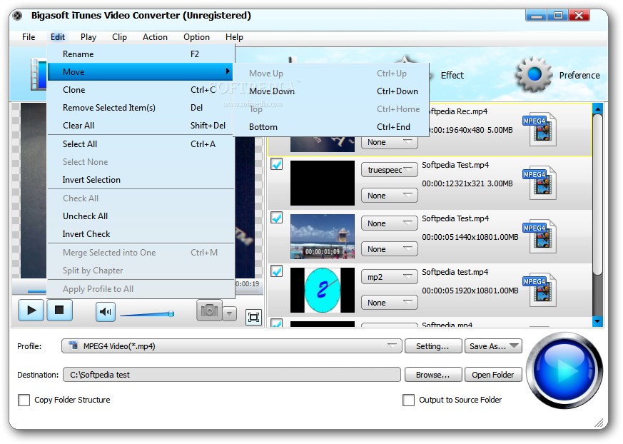 Bigasoft iTunes Movie Converter converts various video to iTunes video MP4, MOV and M4V from various videos including AVI, Xvid, DivX, H.264, MP4, 3GP, MKV, WMV, RM, FLV, MOV, WebM, F4V, Bik, 720p, 1080p, 1080i HD, AVCHD videos.