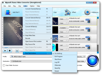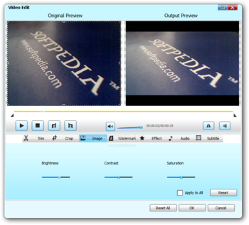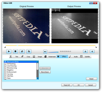 Bigasoft iTunes File Converter enables you to edit your videos like crop video to remove black bars, trim and throw away unwanted part, split videos, and merge several video files into complete one, add watermark and subtitles, rotate video to correct degree, adjust the brightness, saturation and contrast of video and add special video effects such as Old Film, Mosaic, Sand, Snowflake and more.
