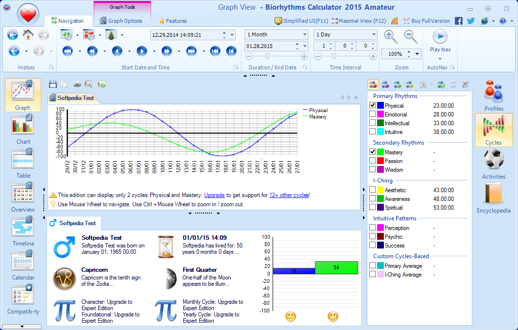 See your biorhythms as never before with 10 customizable and interactive views: Graph, Table, Calendar, Timeline or Report