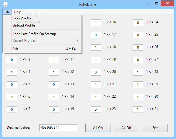 BitMaker Portable is an application you can use to convert 32-bit decimal values to binary code by just filling in some details. It's available in a graphical and command-line interface, and it supports custom profiles.