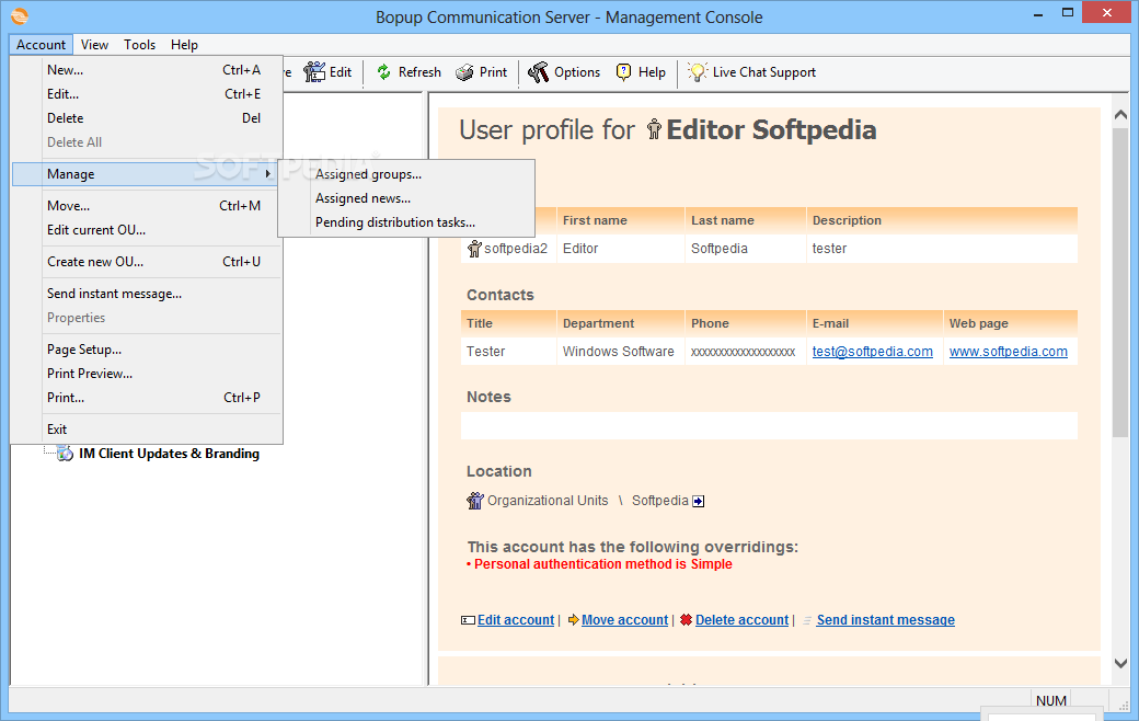 The included Bopup Communication Server console allows administrators to create and manage accounts, to add users into groups, and to apply specific permissions for each account. The tool also includes support for encrypting messages, delivering increased security even when data is sent over the Internet.