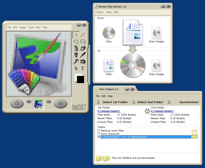 Bronze Tools bundles several separate applications, namely Twin Folders, IconEdit2, Desktop Fay, Bronze Disc Copy and Bronze Disc Burner, each also available as standalone products. To be more specific, the suite brings together the power of a reliable icon editor, a folder synchronization tool, disc burning and copying applications, an email client and desktop assistant.