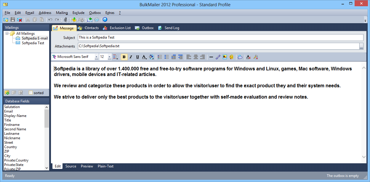 BulkMailer Professional is a demo software by Kroll Software-Development and works on Windows 10, Windows 8.1, Windows 8, Windows 7, Windows XP, Windows 2000, Windows 2003, Windows 2008, Windows Vista, Windows 2012.