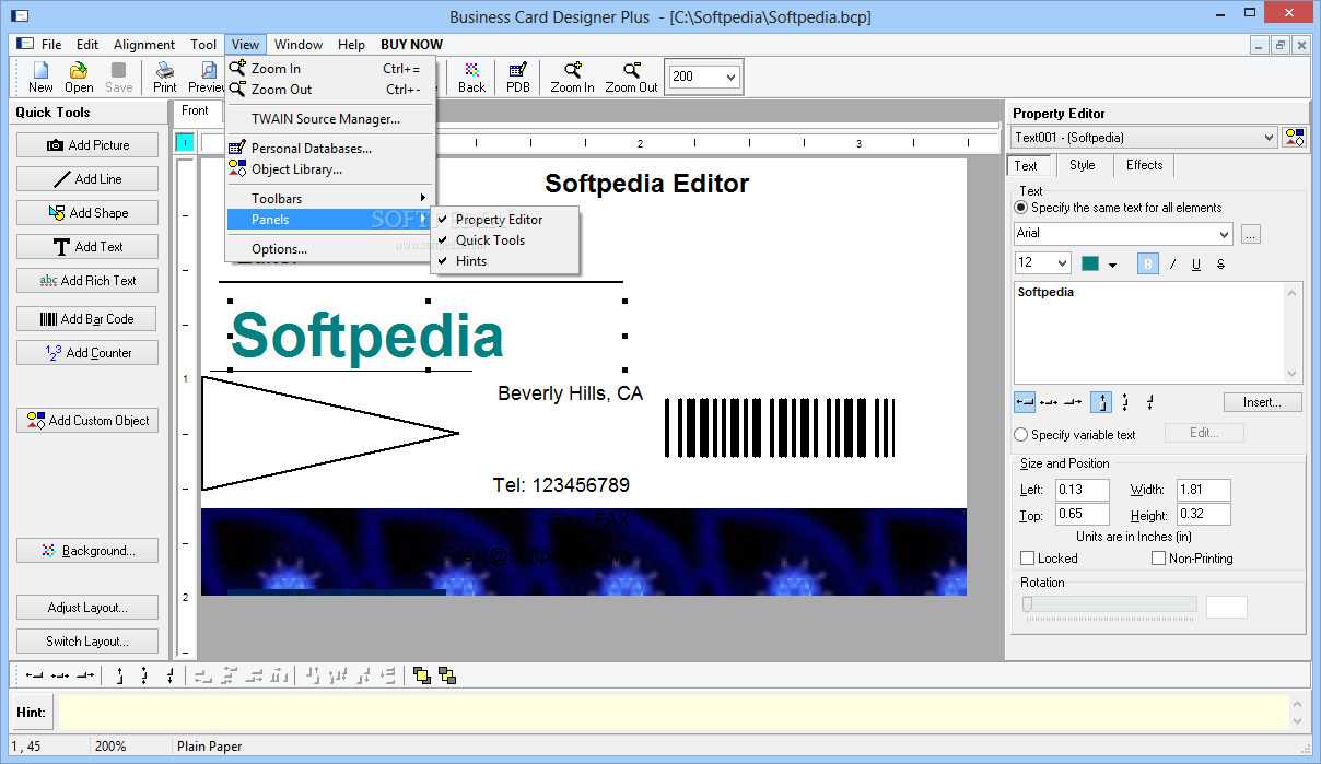 CREATE GREAT LOOKING BUSINESS CARDS ? Use the wide variety of tools to add text, graphics, shapes, barcodes, shadows, arc text and other effects to your design. Vary the color and style of any object for an endless array of possibilities.