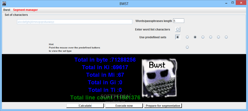Additionally, BWST can calculate the size of the generated list and the number of lines. It comes with ready-to-use character sets and features an intuitive interface.