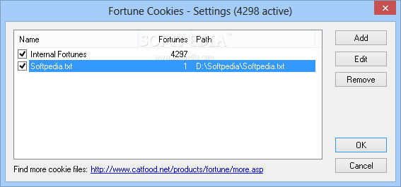 Catfood Fortune Cookies is a free software by Catfood Software and works on Windows 10, Windows 8.1, Windows 8, Windows 7, Windows XP, Windows 2000, Windows 2003, Windows 2008, Windows Vista, Windows 2012.