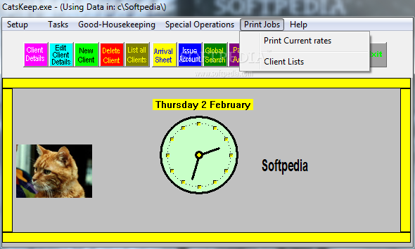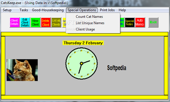 All information that you can enter inside the program can be printed or backed up on your computer. You can also create client records and hid them from anyone who might be accessing the program. It lets you search for database entries by the client's name or the cat's. You can set reminders on various tasks that you would like to complete.