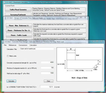 Civil Engineering pavement design calculation software - covers calculations for traffic, road geometry, surveying, earthwork, asphalt pavement, concrete pavement, concrete floors on grade and unit conversions. Supports 32 bit,( x86) and 64 bit (x64) architecture for Windows Operating Systems. Program has built in reference manuals, and coefficient tables for a stand-alone design application. Can open multiple windows to perform multiple calculations at one time and solve complex civil engineering design problems.