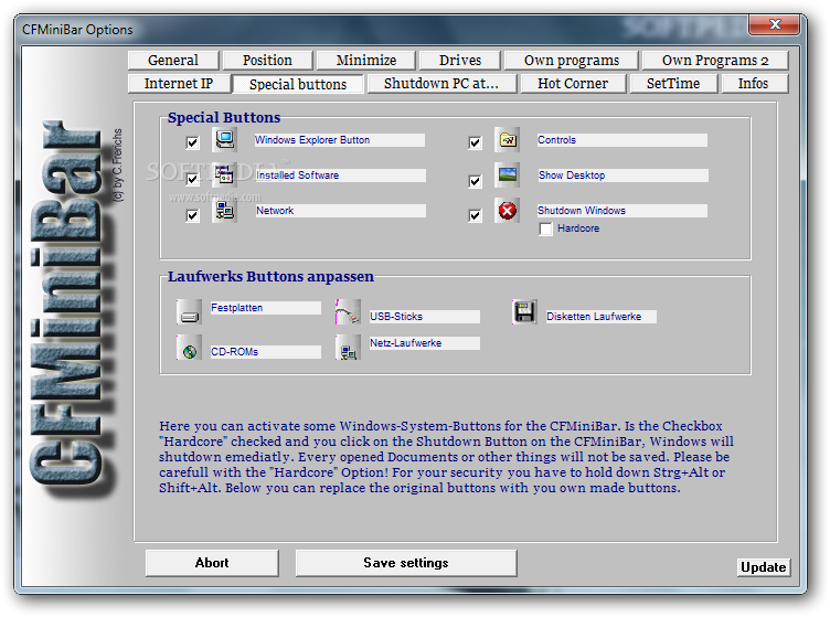 With the configuration panel up you gain access to control over different areas like position, minimization options, drives, own programs in two sets, Internet IP, special buttons, including some extra tools like an automatic PC shutdown utility, hot corner configuration, and time synchronization based on custom sources.