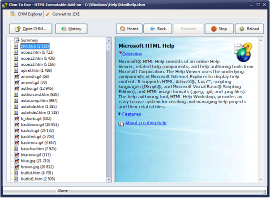 CHM To Exe (or Chm2exe) is a free program that allows you to convert Microsoft HTML Help files (.chm) into executable files. You can open CHM files, explore them, extract all source files and create related HTML Executable projects. You can then compile your HTML Help source files into single and secure executable files that can also be customized with all of the features provided by HTML Executable.