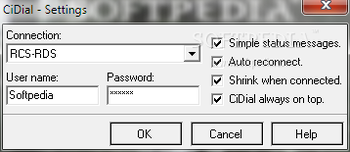 In addition, you can enable simple status messages, ask CiDial to automatically reconnect when the signal is lost and to shrink when connected, as well as make the frame stay on top of other windows. Note that CiDial does not replace Windows' built-in dial-up manager.