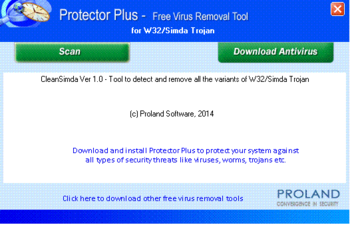 W32/Simda Free Virus Removal Tool will detect and remove W32/Simda Trojan completely, from your system. Download cleansimda.exe and save it in a temporary directory. Double click on cleansimda.exe to execute it. Follow the user-friendly instructions to detect and remove the W32/Simda Trojan from your computer.This virus removal tool will detect and remove W32/Simda Trojan and its variants from your computer. It is a Windows based free virus removal tool designed by Proland Software Pvt Ltd.