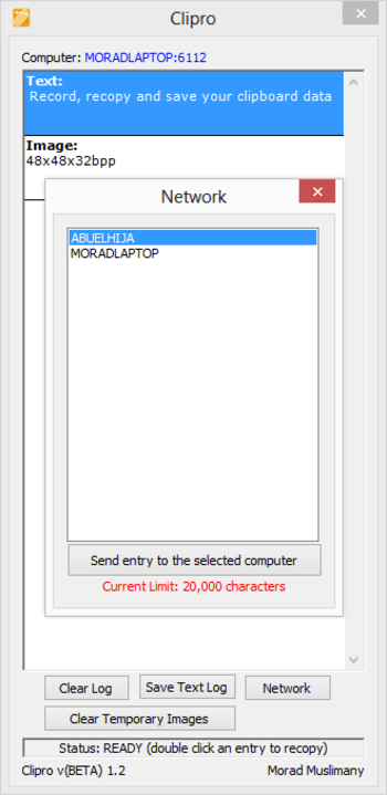 Clipro takes your clipboard to the next level.With Clipro, you will be able to record the history of your text and image clipboard data. Clipro allows you to recopy and retrieve any clipboard entry back, including images, while preserving the option to save a complete log file of your text clipboard entries.Clipro saves your image clipboards to temporary files for you to retrieve later. It does all that while running silently in the background, its home is your tray bar!Clipro supports network mode; you can copy text clipboard entries from your Clipro to other Clipro instances in your other network computers, with the automatic file logging of sent/received text.