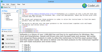 CodeLab offers a comprehensive development environment, which allows you to type/import the source code into the editor. The panel on the left allows you to control the structure of the HTML file, by adding various elements (files, folders). The space near the bottom of the window is designated for compiling the code and helping you preview the result.