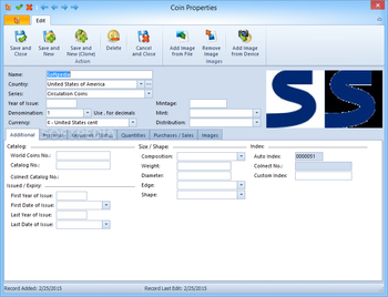 The program creates a database file where you can store all the entries about your coins, with information ranging from 'Name', 'Country', Year of Issue', 'Denomination', 'Currency', 'Mintage', to 'Additional' and 'Personal' facts, even 'Images'.