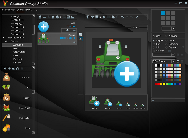 Colibrico Design Studio is a design tool with an extensive icon library.Colibrico Design Studio automates the creation of graphics and icon sets.Providing the graphics via the graphic tool offers several advantages.- The graphics can be exported in any size.- All graphics can be combined.- Color filters can be used to create additional color variations of the graphics.- The graphics are presented in a clear form.- The search function helps you to select a symbol.- With design elements and additional effects, modern and individual button sets can be created in any color With design templates you can create individual graphics, an icon set or a button set easy and fast. For the creation of individual button sets, different design elements with background shapes, frames, lighting effects and shadow effects are offered. Saved color filters or custom changes are applied to all selected graphics. This allows you to create and export multiple color variants in a matter of seconds. Design settings can be saved and reused for additional icon sets. You can create individual color groups and apply them to a flat icon set. You can import your own SVG graphics to speed up the creation of icon sets.The file formats SVG, PNG, JPG, BMP and ICO are supported for export.