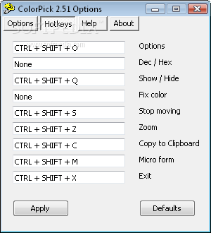Using the slider in the Options window you can change transparency of the color box that follows the mouse pointer. By pressing the Font button you can change its font. Also, you can change the color of the color box background by clicking on the Color button and choosing the desired color. You can check Use middle mouse button check box if you want to control color selection by pressing middle mouse button (or mouse wheel). If you click on the Defaults button, default settings will be applied.