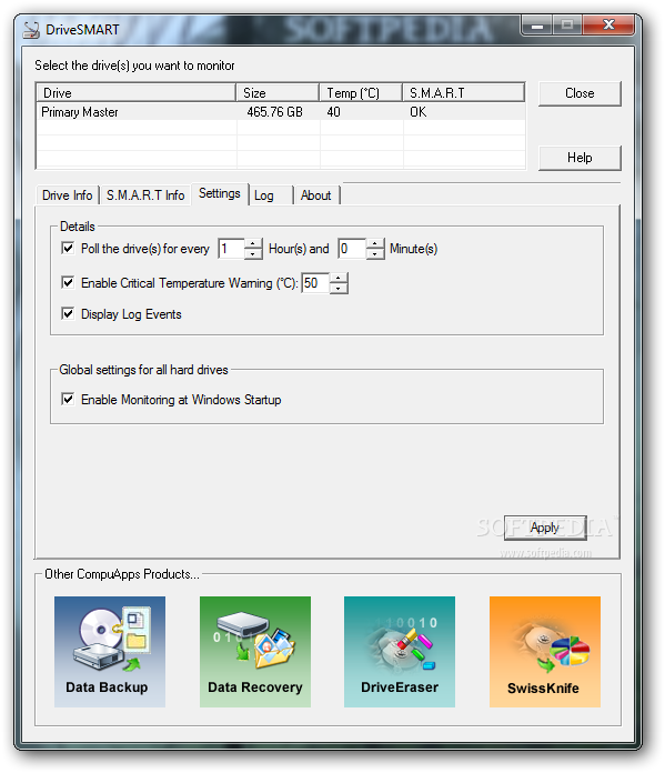 You can download CompuApps DriveSMART which is 1.86 MB in size and belongs to the software category Hard Disk and CD DVD BluRay Utilities. CompuApps DriveSMART was released on 2012-08-20 and last updated on our database on 2017-03-05 and is currently at version 1.11.