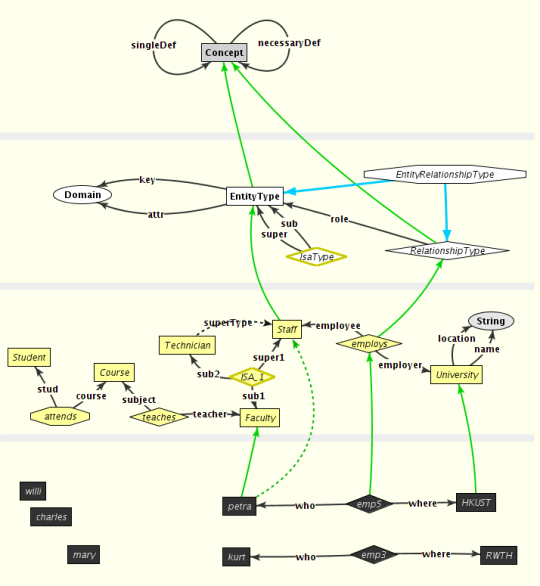 ConceptBase.cc is a multi-user deductive database system with an object-centered data model. Its ability to represent information at any abstraction level (data, class, metaclass, meta-metaclass) makes it a powerful tool for metamodeling and engineering of customized modeling languages. The system is accompanied by a highly configurable graphical user interface that builds upon the logic-based features of the ConceptBase.cc server. ConceptBase.cc can represent information at the data level (example data, traces of process executions), the class level (schemas, process definitions), the metaclass level (constructs of modeling languages), the meta-metaclass level (constructs for defining modeling languages), and so forth. Uniform object representation. All objects are represented in a uniform quadruple data structure called P-facts pioneered by the developers of the Telos language. Objects, their attributes, specializations, and instantiations are all represented as P-facts. By this, for example, attributes of objects can have attributes and are instances of other attributes. Even specialization between attributes is fully supported. Logical expressions. Rules, constraints, and queries are expressed in first-order logic formulas. Internally, the system transforms them into Horn clauses interpreted by a Datalog-based evaluation machine. Logical expressions in ConceptBase.cc can range over any object regardless of its type (node vs. link) and its abstraction level. Datalog is known for being the most robust computational system for evaluating logical expressions. Active rules. Active rules update the database or call external routines as a reaction to events.