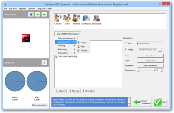 Apply effects (convert Black&White, Sepia, Histogram equalization, Blur, Sharpen, Median filtering, Add watermark for copyright protection)