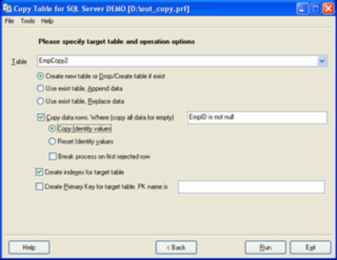 Copy table function allows you to create copy of selected table (definition and data) to another database or Microsoft SQL server. A few options like rows selection or "identity copy mode" make copy process more flexible. This handy utility helps database developers, performance tuners and database administrators to create a second copy of a table within seconds. The program has easy to learn and to use wizard interface, built-in and online help. The copy utility is a true Unicode Win32 application that compatible with all modern versions of Microsoft Windows.