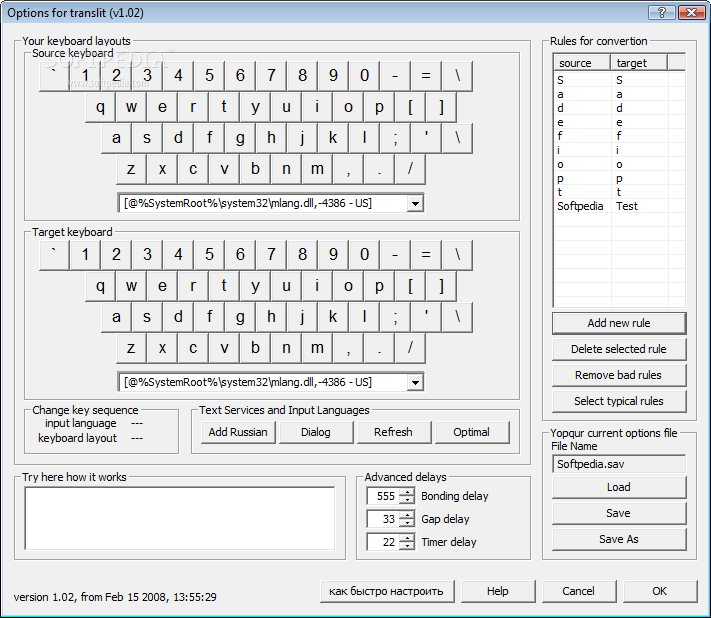 In addition to that, it is possible to create conversion rules between the different keyboards, as well as view and select typical rules. Bonding, gap and timer delay periods can be adjusted with ease, while you can also save all your options to a custom location on the hard drive, using a SAV file extension, so that you can use them at a later date.