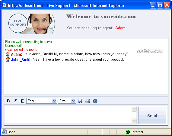 Cute Live Suppport is a real-time online chat support based on AJAX technology. This live chat software program providing live website monitoring, live help and live support to visitors for sales and customer service. It has a host of exciting built-in features, these include: Instant Messaging between operators, Operator Chat Transfer, Multiple Chat Queues (ex. Sales and Support), Canned Responses, Send files and more.Cute Live Support for IIS provides real-time, live chat and live visitor traffic monitoring for your website. Cute Live Support has a host of exciting built-in features, these include: Corporate Instant Messaging between operators, Operator Chat Transfer, Multiple Chat Queues (for example Sales and Support), Chat Conferencing and Operator 'Coaching'. There's even a Co-Browse feature that allows operators to view the exact page the visitor is viewing on the website at that moment. Other features include, Link Referrer Tracking and Navigation History, Chat Survey Generator, Page Push, Secure Chats, Operator Initiated Chat, Spell Check, Canned Responses and more. All data is stored in the included Microsoft SQL Database allowing instant retrieval of visitor history as well as previous chat transcripts. Written in .NET and using the latest Microsoft Technology, Cute Live Support is cost effective, easy to use and setup. There are NO recurring monthly fees (You buy it, you own it) and it is installed and hosted locally on your server. Unlimited free voice technical support is provided. Cute Live Support accommodates small to large businesses.