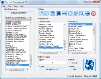 Das Unit Converter is an easy-to-use freeware program that can handle virtually all of your unit conversion needs. With over 2000 units, over 80 categories, and with the capability to add more (units; categories), you may never need to use an online converter or a search engine for unit conversions again. Some features include: Online updating, world currency, conversion history, customizable outputs, and support for math operations/functions. The portable version is the non-installer build of Das Unit Converter. Use the portable version if you want to be able to use Das Unit Converter from say, a USB disk or a memory card (so you can take it where ever you go). You can also use this version if your Windows login lacks administrative rights (since all settings are written in the local folder).