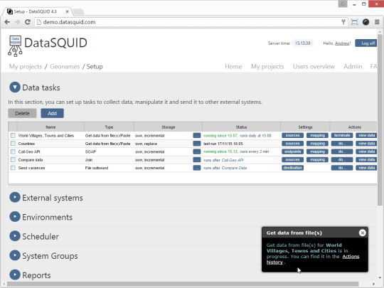 DataSQUID lets you collect data from anywhere, import it, manipulate it and distribute it, all with a simple intuitive GUI. Typical uses are: - File download and data import from FTP, sFTP, FTPs or websites - Data load from other databases or APIs (requires Personal edition or above) - Creating a history of changes to data (requires Personal edition or above) - Data transformation - Data reconciliation and comparison - Sending data to FTP, sFTP, FTPs sites - Scheduled tasks (requires Personal edition or above)