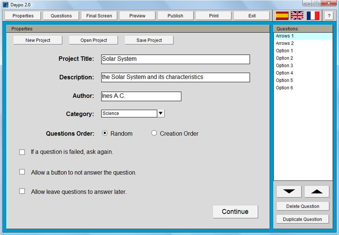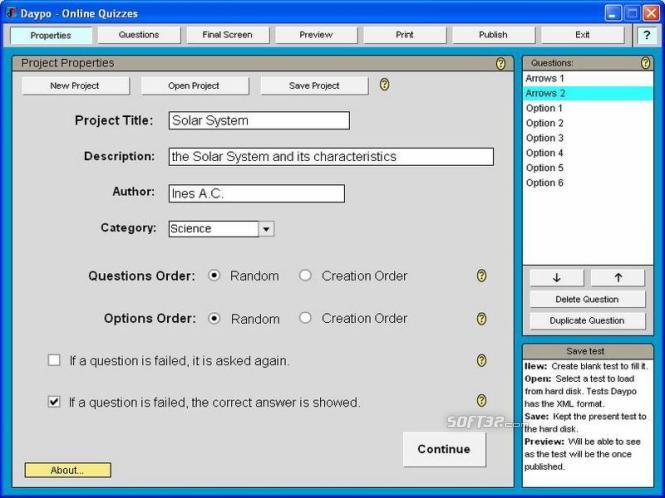 The Daypo program is designed for create, edit, print , save and publish online tests for e-learnig. You can create your own tests to learn yourself, for repeating until you memorice then, and the best, it's totally free. Your test can help other people who want to learn just like you, or simply you raise it to the rest of the internet users. You have a lot of options to the tests: diferent time to answer, sections, repeat until you have correct answer, options, checks, arrows questions, previews, diferents points, personality tests...