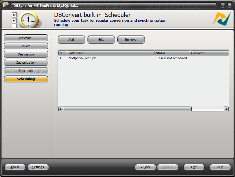 DBConvert Scheduler gives you an opportunity to run DBSync for MS FoxPro & MySQL program sessions and any other applications on a user defined schedule that means that you can run programs without user control after having scheduled task once.System requirements32 MB RAM
