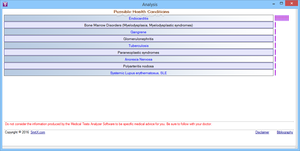 The possible health disorders are listed in order of likelihood, and you can click on each of them to view all the data the application can offer. This includes a short description, normal test result ranges and all symptoms associated with the health condition.