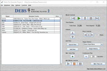 You can play Zipped Mp3/CD+G Karaoke Files from your computer. This program has a built in database that allows you to search your computer for songs to add to the Play List. No more carrying cds around or looking through cds for a song! Debs Pro Karaoke Player 2 allows you to run your show on a separate display. If you have a second dispay window configured, you can run your program on your laptop, and use the second display for your Song Lyrics and the Next Singer Screen. Its simple to use. Create a Database list of your Karaoke songs. ** No need to specify any file format when building a database. Simply select the directory containing your Karaoke files, and all the zip and mp3 files from that folder will be listed in the Database. Select the Search Button, enter any word pattern, and search for your favorite songs. Double-click the song, and it will be queued in the Play List. With Drap N Drop, you just select the folder or file you would like to queue, drop it right onto the Play List, and double click on the song youd like to play. Automatically saves Singer History. Search on a singers name, double-click their favorite song, and it will be queued in the Play List. Create an Mp3 Play List and automatically play mp3s and videos after each Karaoke track ends.