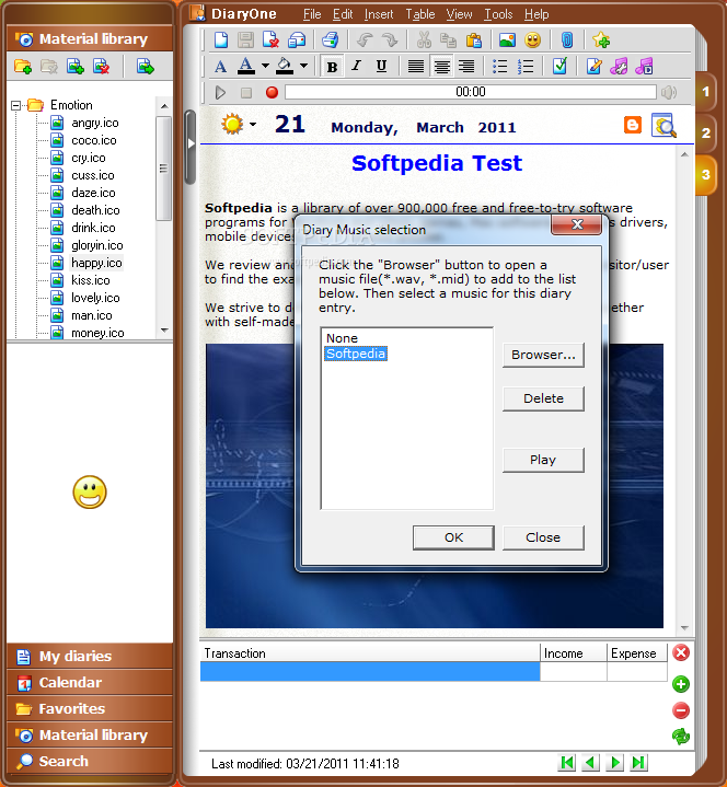 Multimedia information - DiaryOne software can store not only texts but also multimedia information including sounds, pictures, etc. Sometimes you don't want to type into the diary software, you can speak to DiaryOne and it can record your voice. That's the sound diary. And DiaryOne has a built-in cash flow accounts keeper, you can write down your imcome and expense every day then get the monthly cash flow report.