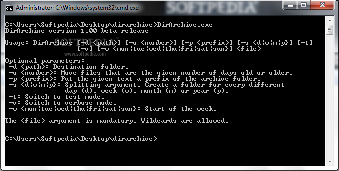 By default the archive folder is a subfolder of the source file. This argument will allow the use of a different destination of the archive folder. Relative direction is allowed and will be relative from the view of the current directory.