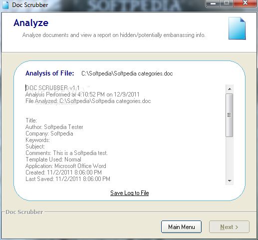 Doc Scrubber can remove much of this metadata from Word documents, and can also produce an analysis of any Word document to show what metadata it contains. The program allows you to see that information, and scrub it from files before sending them to others.