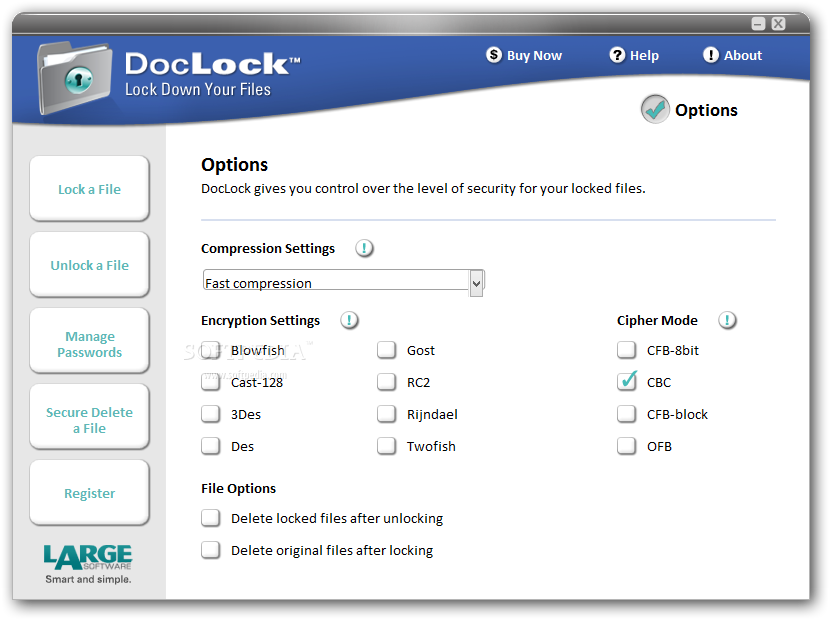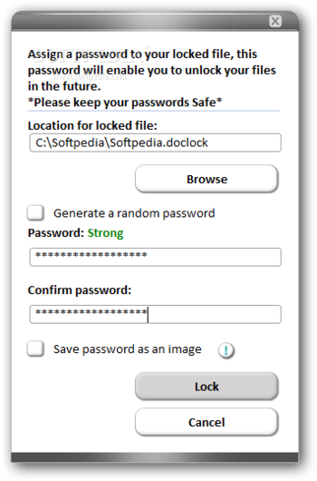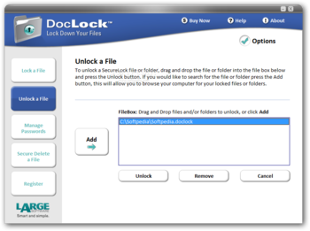 docLock 2016 allows you to select files, folders, documents, photos, videos, Zip files, PDFs you wish to lock and password protect. Secure only the files you wish to keep safe. docLock allows you a simple way to password protect any personal or sensitive information. Protect yourself from identity theft, financial loss and privacy invasion. Install and run in minutes. Follow the "Getting Started" screen to lock your first file in a matter of seconds. No need to read help files, documentation, user manuals, or call the neighborhood computer guru to get started. Lock/Unlock a document at lightning speed with shortcuts options; 1) drag and drop the file to docLock, 2) right click the file and choose to Lock/Unlock, or 3) browse to your desired file. docLock allows you to share any locked file via e-mail, disk or portable drive with a friend as long as they have the password you created. Feel confident the recipient will be the only one able to access the file.