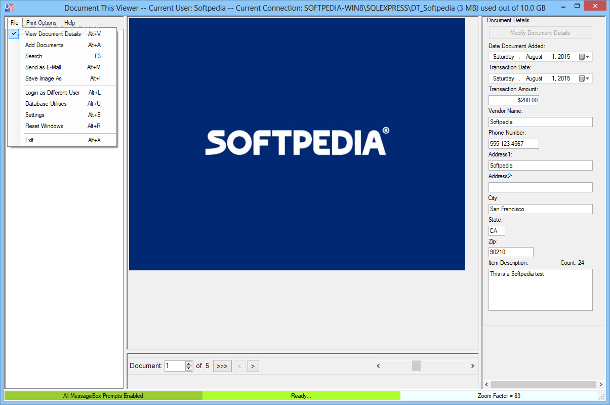 After connecting to a database, you can use it to store any number of files. When adding new documents, the program allows you to specify a large amount of details, from an item's name, to transaction amount, vendor name, phone number, address and a short description.