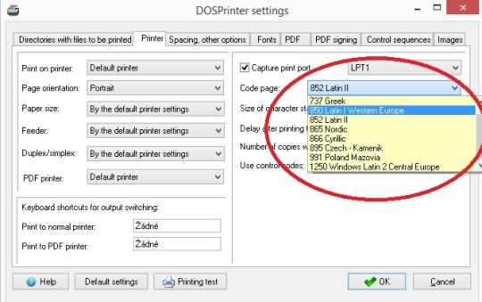 Supported codepages: 437 Latin US, 737 Greek, 850 Latin I, 852 Latin II, 865 Nordic, 866 Cyrilic CIS 1, 895 Czech Kamenik, 991 Mazovia, 1250 Windows Latin II.