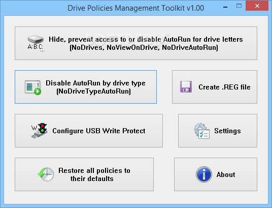 Drive Policies Management Toolkit is a lightweight and efficient piece of software that was developed to assist you in adjusting the Windows drive policy, enabling you to hide specific disks or prevent AutoRun.