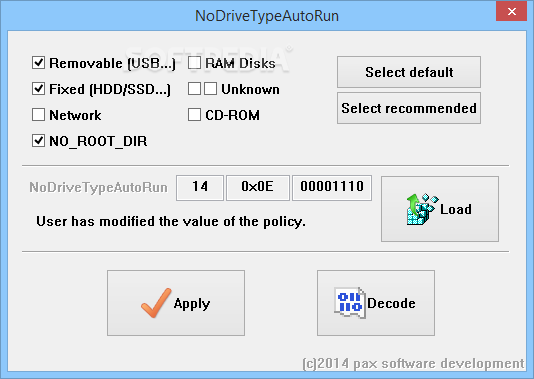 Moreover, Drive Policies Management Toolkit lets you disable AutoRun only on a specified type of disk, for instance the removable or fixed ones, network drives, CD-ROMs or RAM disks, depending on your individual preference. From the ‘Settings’ section, you can determine whether to apply the modifications to the current user only, or to all PC users.