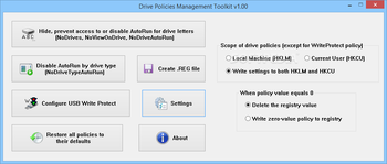 To conclude, Drive Policies Management Toolkit is a useful and reliable application that can successfully assist you in customizing the way your drives behave, being able to hide them or disable AutoRun, with minimal effort.