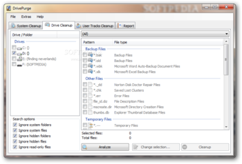 DrivePurge features three built-in scanning modes which look for invalid registry entries present on your system, backup and temporary files, as well as Internet tracks.