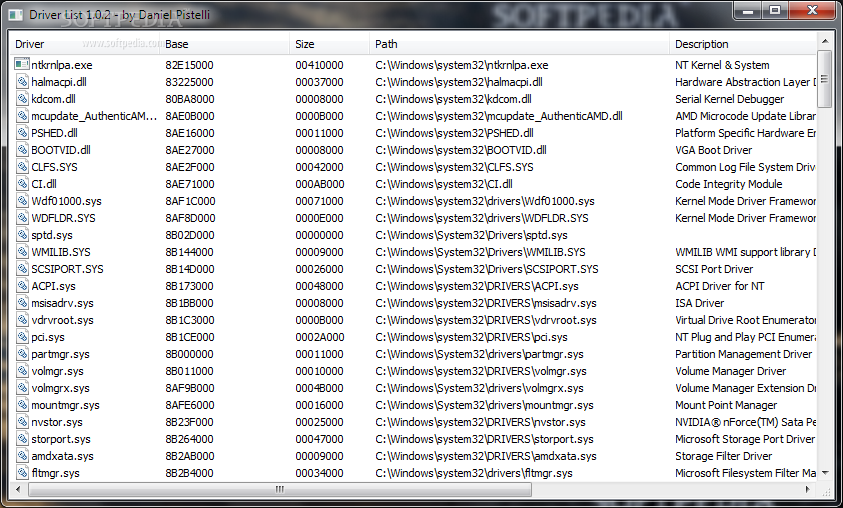 As soon as you launch the component you need, a compact window shows up with an organized table that shows all detected drivers, along with information columns like base, size, path, description, company, and version. If you consider the list isn’t showing all drivers, there’s the possibility to instantly refresh.
